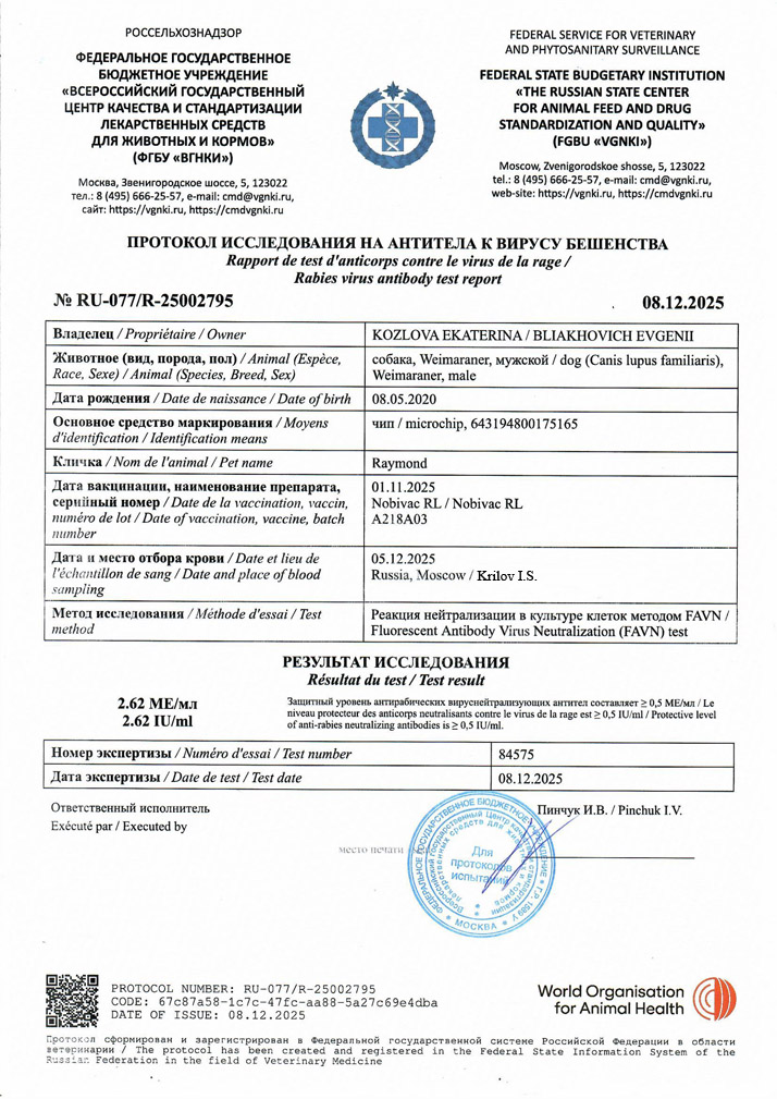 - Ну и последнее, на чём нам бы хотелось сосредоточить ваше внимание, так это на внешнем виде и способах защиты от подделок, которыми, до сих пор, иногда промышляют нечистые на руку дельцы. Чаще всего подделывают титры на антитела к бешенству от лаборатории ВГНКИ, на которых стоят QR code, которые ведут в никуда, либо, что гораздо хуже, ведут на поддельный сайт лаборатории, который по ссылке может отличаться от оригинального на какую-нибудь незаметную букву. Сразу хотим предупредить, что в настоящее время каждый тест на антитела проверяется инспектором на ветеринарном контроле очень досконально и при малейшем сомнении инспектор звонит в лабораторию, чтобы проверить подлинность данного документа. Правда это касается тестов, которые сделаны по старой схеме на цветных бланках до 01.12.2025. Также спешим сообщить, что отныне, с указанной даты, лаборатория выдаёт готовые титры на антитела на белых бланках, на которых также присутствует QR code, но, в отличие от прежнего, новый код ведёт уже не на сайт самой лаборатории, а уже на сайт единой платформы Ecert, в которой выписываются все ветеринарные документы России. Само собой разумеется, что теперь любой ветеринарный врач в государственной клинике, а также любой инспектор на ветеринарном контроле в аэропорту, видят все сделанные тесты в он-лайн режиме, а потому крайне не советуем шутить с этим вопросом. Ну и, для наглядности, по ссылкам ниже вы можете посмотреть, как выглядит старая и новая форма титров на антитела: Тест старого образца / Тест нового образца.