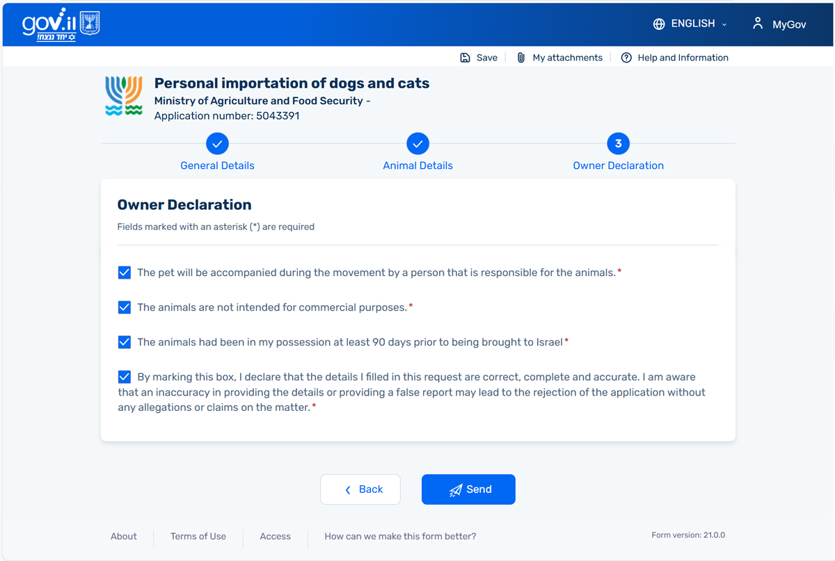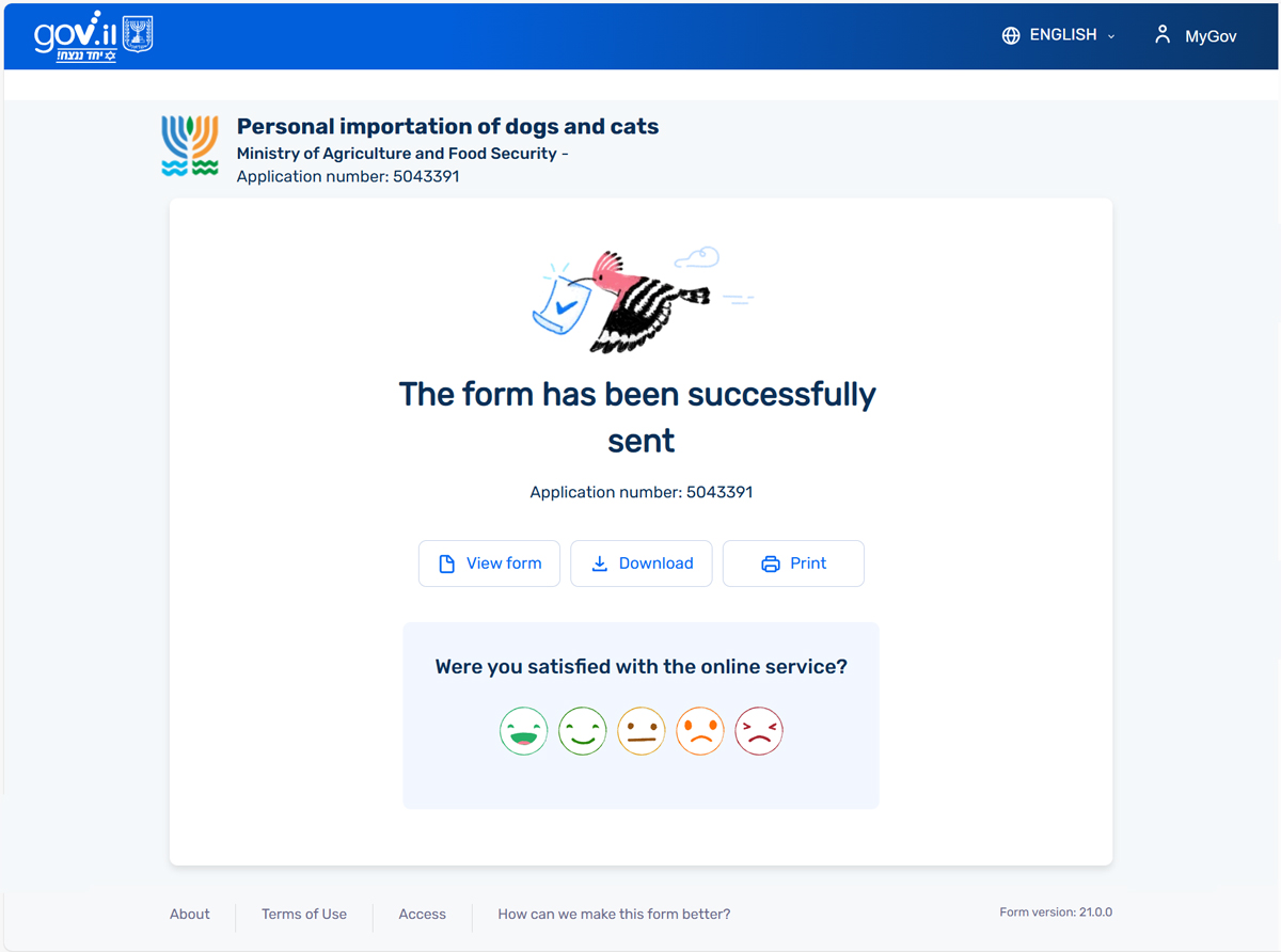 Осталось дождаться ответного письма от Министерства сельского хозяйства Израиля и скачать прикреплённое разрешение на ввоз в Израиль вашей собаки или кошки.